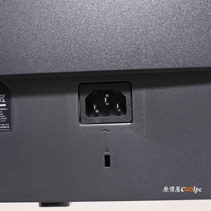另外一邊則是電源插孔,變壓器直接嵌入電路板上,只要插電源線即可,底下還有一個 Kensington 防盜鎖孔。