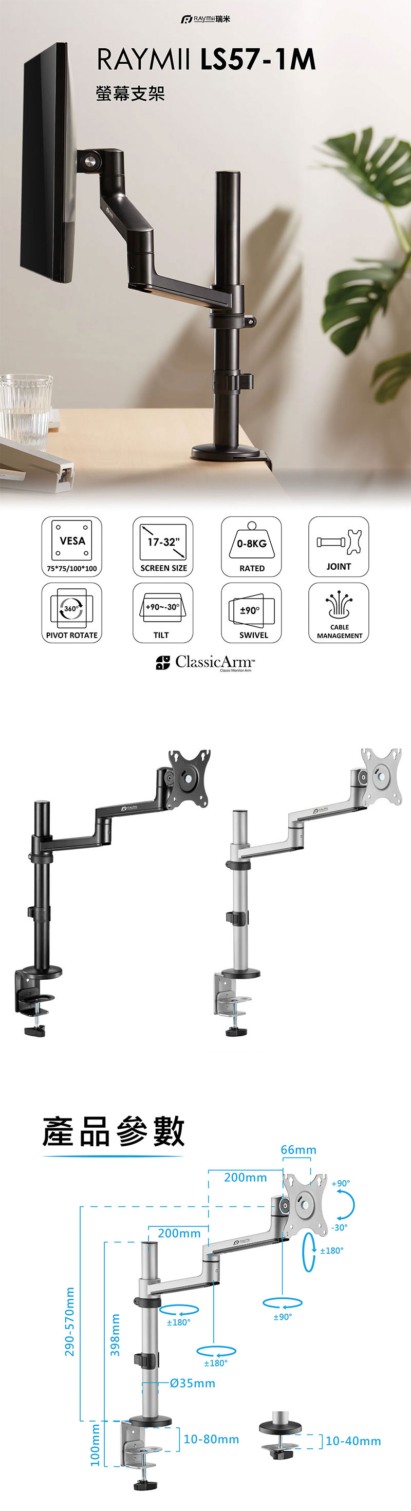 Raymii LS57-1M (單螢幕/穿夾兩用/鋁合金懸臂/關節式/17-32吋/承載8KG/黑色) $1,499 送酷幣600