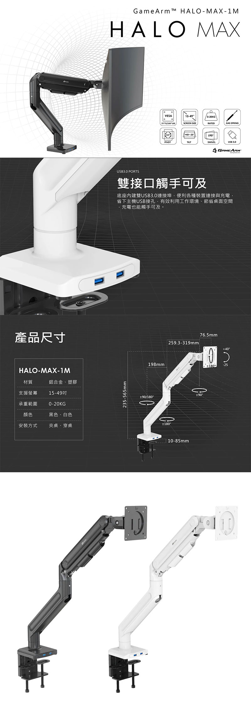 這麼多款要怎麼挑呢?入門首選推薦 LS57-1M 鋁合金懸臂單螢幕款,高質感的銀黑雙色設計,重量承載 8 KG,最大尺寸可安裝 32 吋;若您是多工效率派,可選 LS57-2M 雙螢幕款視野加倍,效率翻倍;若您追求靈活的操控感與擴充性,L-U9-1M 與 LS-67 M1 機械彈簧系列 絕對是你的得力助手,兩者皆貼心配置 USB3.0 與 TYPE-C 接口,傳輸充電隨手可得,L-U9-1M 承重 10KG、LS-67-M1(黑/白)承重 11KG,外觀設計也比較好看,適合在辦公室使用;對於擁有 32 吋以上螢幕或曲面的玩家,HALO-MAX 氣壓式系列絕對是首選,無論是承重 20KG 的 HALO-MAX-1M 或是承重 27KG 的 HALO-MAX2-1M,都能輕鬆駕馭 49 至 57 吋的螢幕,內建雙 USB3.0 擴充,傳輸充電更便利,讓桌面更簡潔,歡迎有興趣的朋友可以利用網路下單,或到門市做詢問囉。