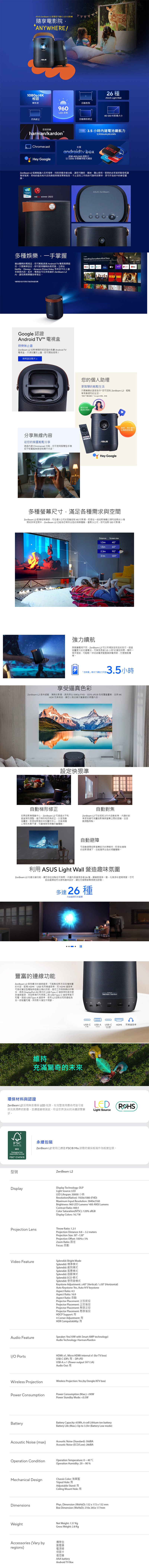 ASUS ZenBeam Latte L2 智慧可攜式LED投影機 $13990↘$11111