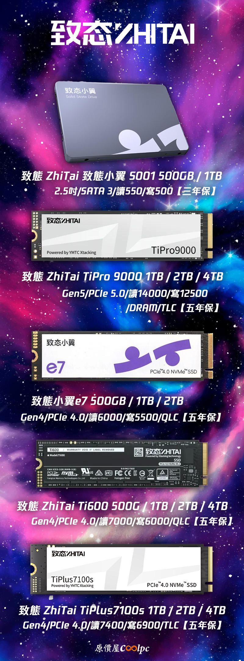 這次參加活動的陣容非常齊全,不管你是追求極致速度、想挑戰 PCIe 5.0 性能巔峰的 TiPro9000 系列,還是想要 PCIe 4.0 高效全能的 TiPlus7100s,甚至是打算找大空間首選的 Ti600 都有。如果是想拯救家裡那台老筆電或舊桌機,也有 SATA 介面的致態小翼 S001 系列可以選擇,完全不用擔心找不到適合自己的型號!歡迎各位有需求的玩家到原價屋門市做詢問,或是到原價屋線上估價系統及原價屋蝦皮商城下單唷!
