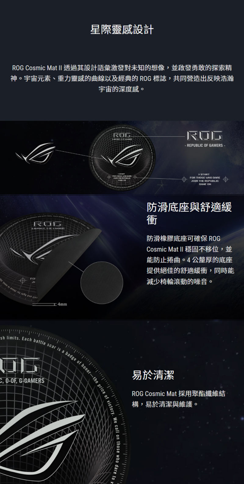 這回活動一共有兩種款式的電競椅,其中一張是純粹性能派,低調但超能打的「ASUS ROG SL302C Courser CORE 電競椅」。價格為 $19900,如果你是那種不需要花俏,但要舒服到可以連坐八小時的玩家朋友,那 Courser CORE 絕對會正中你的心!整體設計走的是 ROG 經典戰術風格,線條俐落、外型硬派,但真正厲害的都藏在細節裡。高密度冷泡成型泡棉,久坐不塌、支撐夠硬,符合人體工學的椅背曲線,能自然貼合背部,減少長時間對脊椎與腰部的負擔。再搭配可調式扶手、椅背後仰機構,不管是認真打 Rank、剪片、開會,還是中途小躺回血,都能找到最舒服的位置。這張椅子就是一種感覺:坐下去,你會忘記時間啊!再來,就是專業狂熱玩家的首選~可說是戰位信仰值直接點滿!「ASUS ROG SL302 Courser RGB 電競椅」,價格 $24900,如果你覺得電競椅沒有 RGB 就像鍵盤沒燈,那 Courser RGB 就是專為你準備的~在 Courser 系列頂規版本當中,ROG 把品牌靈魂直接灌進椅子裡,可發光的 ROG RGB 燈效系統,低調嵌入設計,不浮誇,但一亮就知道是主角!同樣具備頂級人體工學結構與高品質材質,舒適度與支撐性全面到位,再加上 RGB 氛圍燈效,直接把你的電競房升級成直播間等級。晚上開機那一刻,你不是準備打遊戲,你是在沉浸戰鬥模式。這回新上市就加碼!「ROG Cosmic II 地墊」直接送了~只要入手兩張電競椅任一張,上市優惠期間內購買,你就有機會拿的到!地墊不只是防刮,更是整個戰位的完成拼圖。滑順移動、穩定止滑,讓你的電競椅移動不卡、不傷地板,整體視覺一致性也直接拉滿呢!