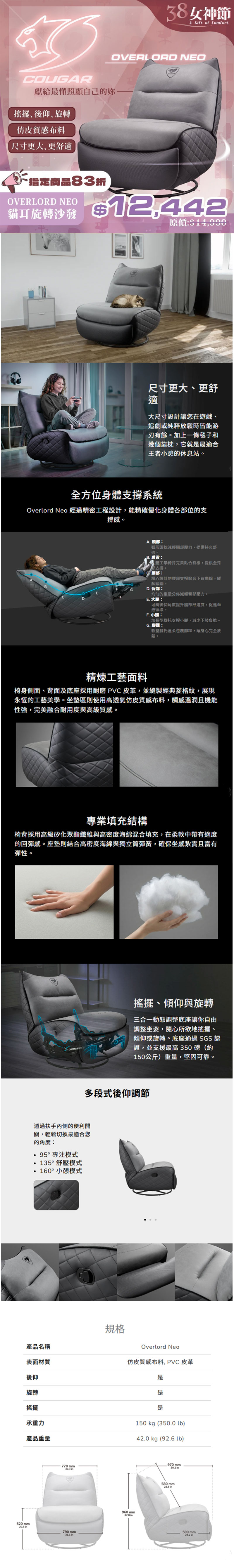 這次活動到底有什麼品項?首先就是坐感代表「Cougar Stryder 人體工學椅」,黑、灰、白三種顏色。原價 $6990,女神節限定價只要 $5802!主打人體工學設計,從頭頸到腰背完整支撐,長時間剪片、加班都不怕坐到懷疑人生~簡約俐落的外型,不論是甜美女神風、極簡質感派還是冷酷科技感,都能完美融入你的空間。現在 83 折入手,等於用更輕鬆的預算,換來每天的舒適升級!如果你想慵懶一點,那「Cougar Fidom 電競可旋轉搖椅沙發」絕對不能錯過!黑橘、灰橘兩色選擇,原價 $10990,活動價 $9112。可旋轉、可搖擺的設計,打完一場直接進入放鬆模式,像被溫柔包覆般的坐感,讓人一坐就不想起身了!至於你想要霸氣王者風格,那「Cougar Overlord Neo 電競沙發」就是它了!原價 $14990,女神節價 $12442,大尺寸設計與厚實坐墊,給你滿滿存在感!客廳瞬間升級成主場舞台啦~當然,不只坐得好也要站得穩!「Cougar E-Ares 120 電動升降桌」原價 $12990,現在也只要 $10782。電動升降一鍵切換,坐站交替更健康,不論是辦公、直播還是認真衝分,都能找到最順手的高度。寬敞桌面配置電腦設備綽綽有餘,理線設計讓桌面清爽俐落,女神級桌面美學從此誕生!