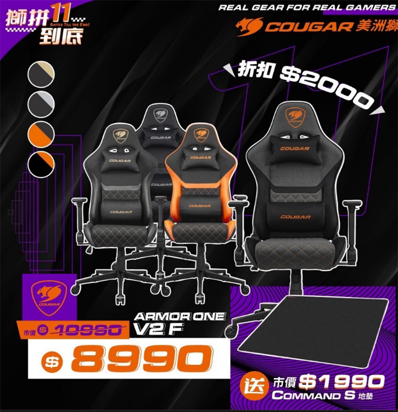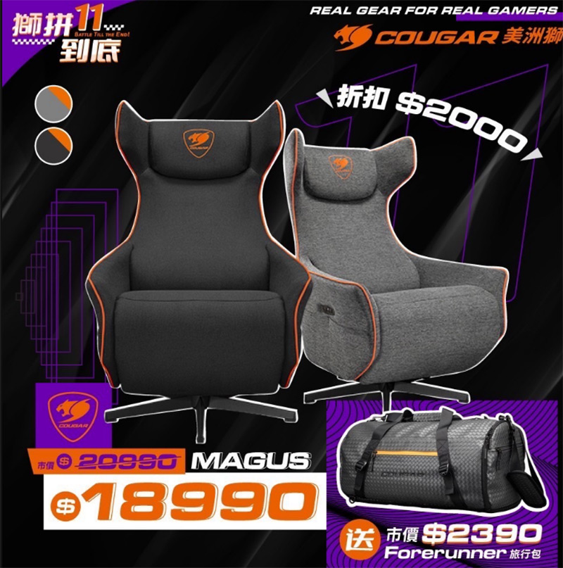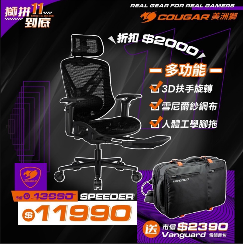 COUGAR美洲獅絕對稱得上電競椅界的扛霸子,像雙11這種場子自然少不了他來站台,今天同時也有變臉王COUGAR ARMOR AIR電競椅促銷,採用透氣彈性網布與可拆式皮革椅套,兩種風格一年四季使用都不成問題,現在直接折四千。注重肌膚觸感的人可以看看COUGAR ARMOR ONE V2系列,採用編織布料或仿亞麻布料,提供優異膚觸並增強舒適性,它還有4D可折疊扶手設計,除了支撐之外也能折疊騰出更多活動空間,這張折價兩千再送COMMAND S大地墊。當然想找人體工學椅也還有其他款式,COUGAR SPEEDER將賽車美學融入工學椅之中,選用透氣親膚的雪尼爾紗線網布,弧形紓壓椅面設計,還有特色3D 225°超旋轉扶手多向支撐,頭枕、椅背高度、腰靠高度、座椅深度都能調整,舒適度絕對沒話說,今天便宜兩千還送VANGUARD 電競背包。就連電競沙發都沒缺席,有搭載全電動傾仰系統的COUGAR MAGUS,具備零重力漂浮人體工學,還能270°自由旋轉,椅身都是舒適的透氣仿亞麻布料,還有收納袋可使用!這張優惠兩千送FORERUNNER 旅行包。果然電競家具就是要找COUGAR美洲獅,好康多到拿不完呢!