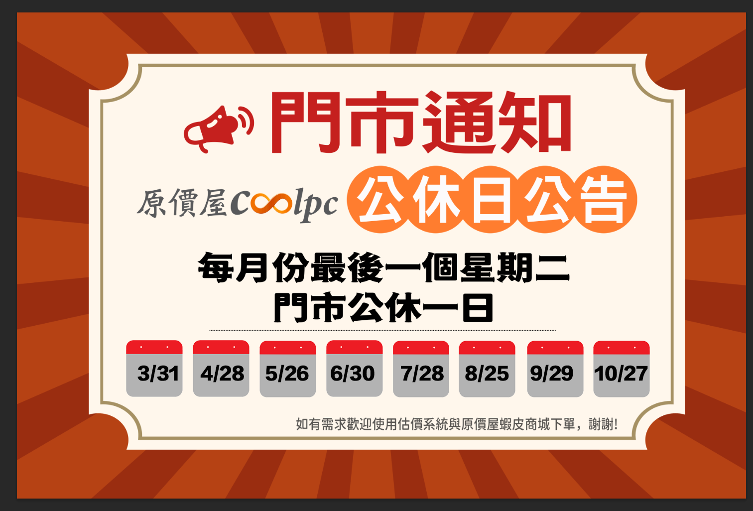 本年度起,原價屋每月新增多一個公休日,排定時間與光華商場相同,皆為每個月最後一個星期二,實體通路公休一日不營業,惟虛擬通路無休仍正常運作,造成不便之處請見諒,有需求也歡迎多加利用原價屋線上估價系統原價屋蝦皮商城下單,謝謝。