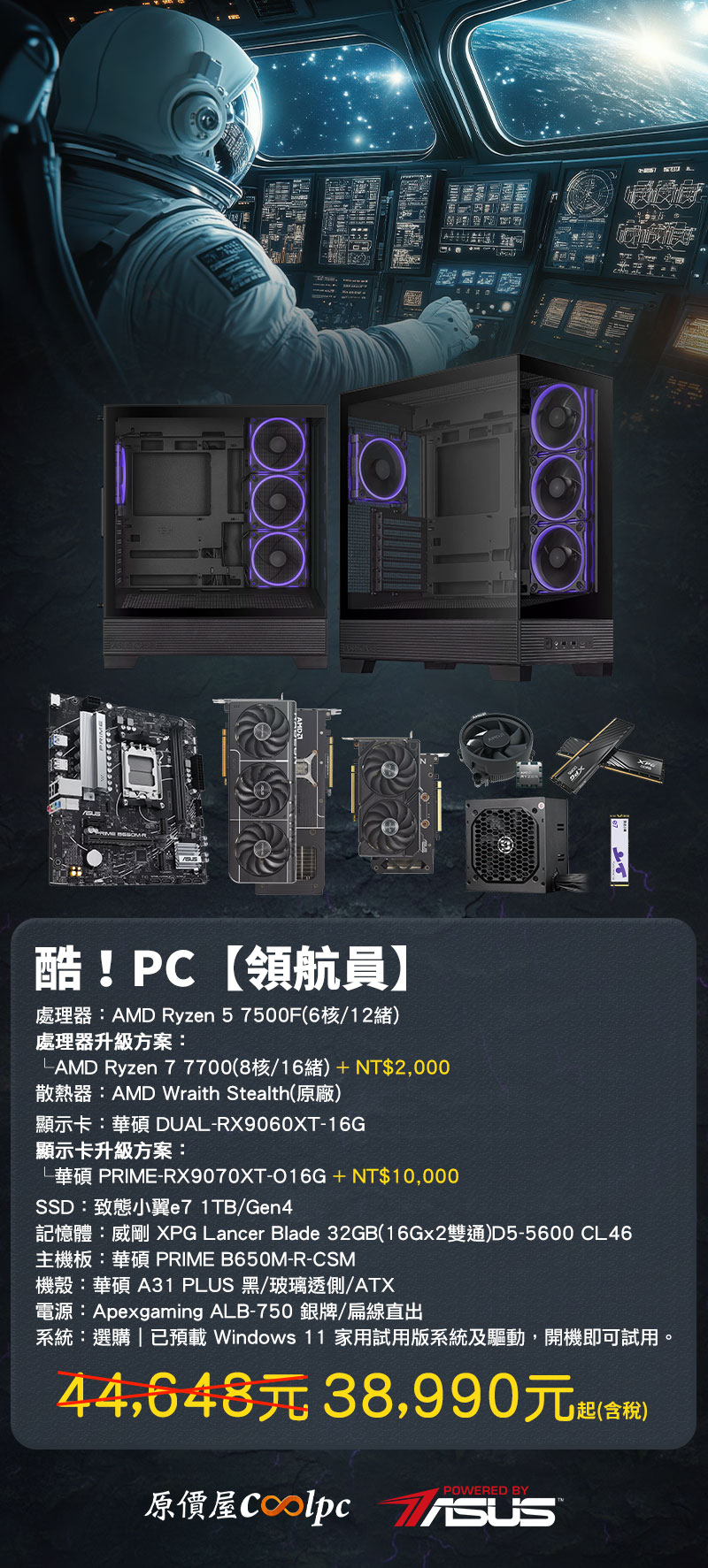 甭客氣…與板卡廠協調,替玩家們創造最佳 C/P 值是本分!我們直接端出純度最高的酷!PC【領航員】3A 平台(AMD CPU + GPU + MB),標配 Ryzen 5 7500F +  Radeon RX 9060 XT,讓你在 2K 解析度下無所畏懼,光追效能更是突破以往。經過我們種種的核算,這套配置在確保性價比的同時,提供彈性升級方案,不論升級 R7 7700 擁抱多核多工效能,或升級 Radeon RX 9070 XT 邁向 4K 遊戲。這種進可攻、退可守的彈性配置,絕對能滿足專業玩家對 3A 戰力的嚴苛要求!