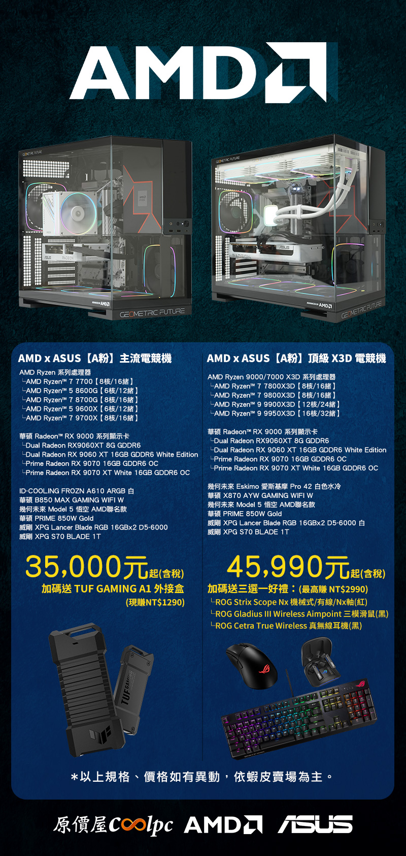 AMD x ASUS【A粉】X3D 頂級電競機 NT$45,990 – NT$71,890