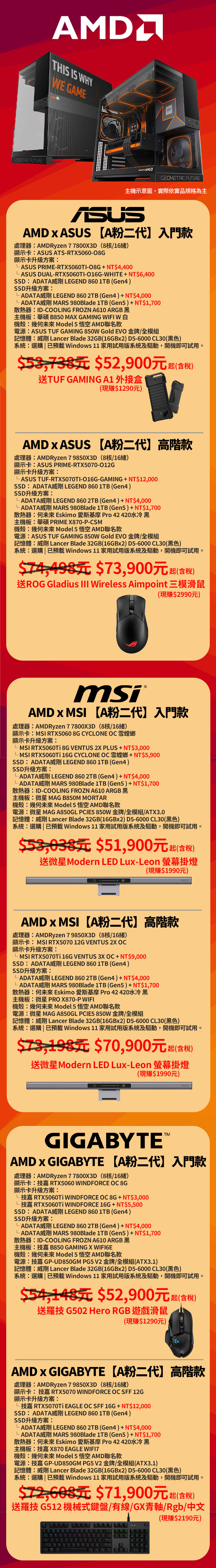 AMD x GIGABYTE【A粉二代】【高階】電競機 NT$72,608元 NT$71,900元起